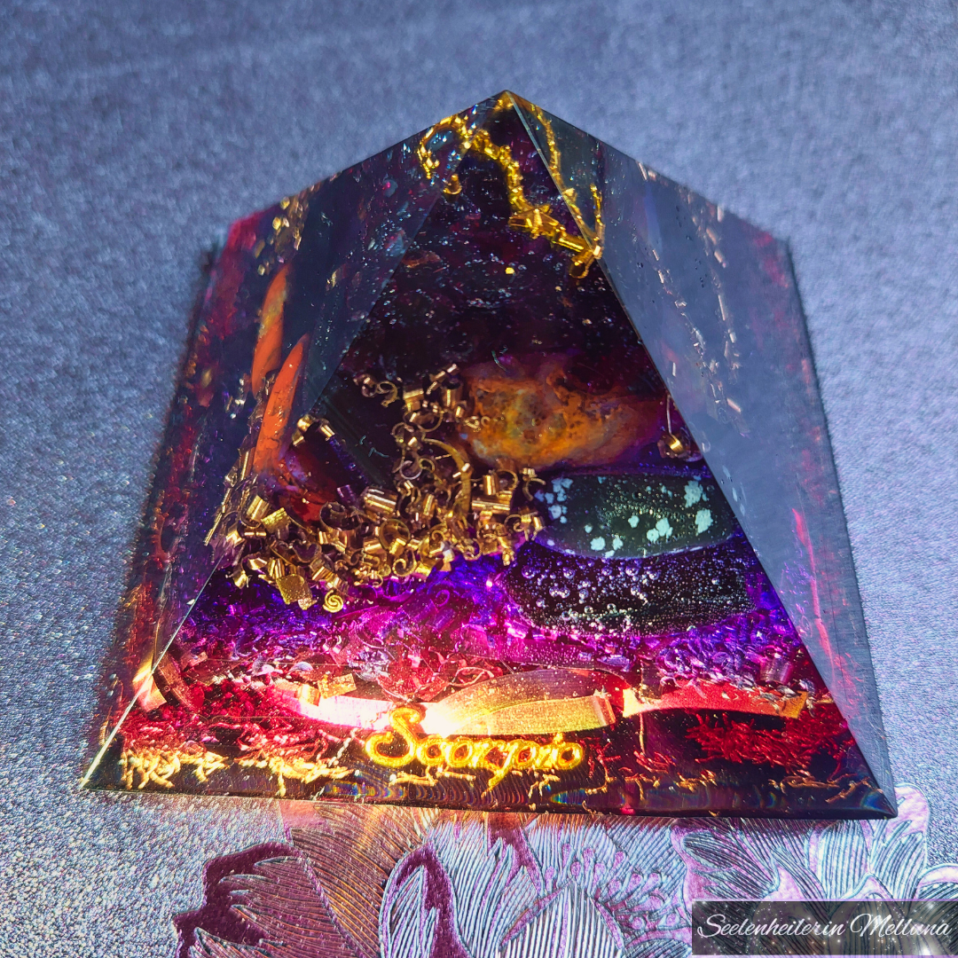 In der Pyramide befinden sich u.a. Achat-, Crazy Lace-Achat-, Karneol- & schwarze Obsidian-Rohsteine - aufgeladen mit Sonnenlicht sowie kleine Granat-Splitter.