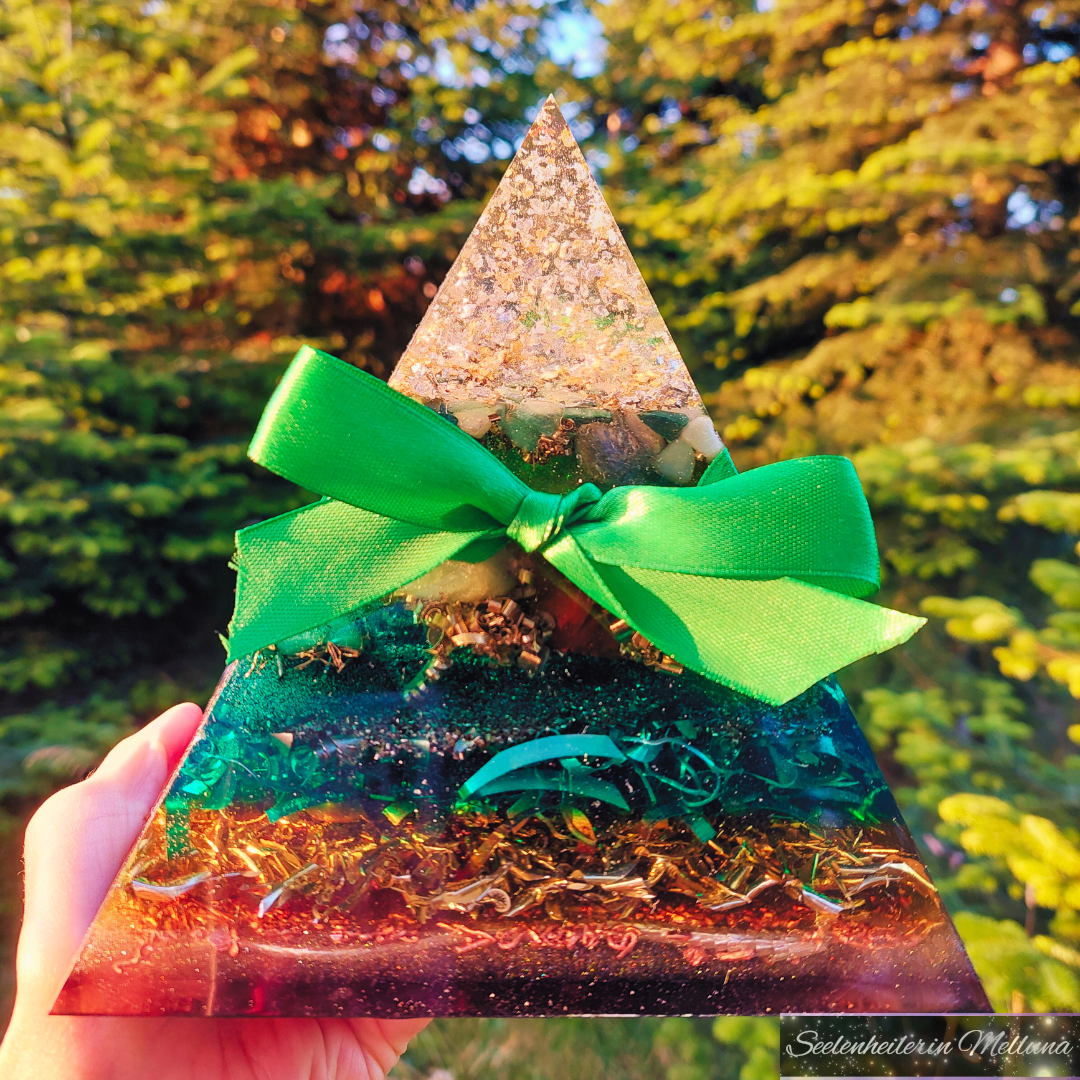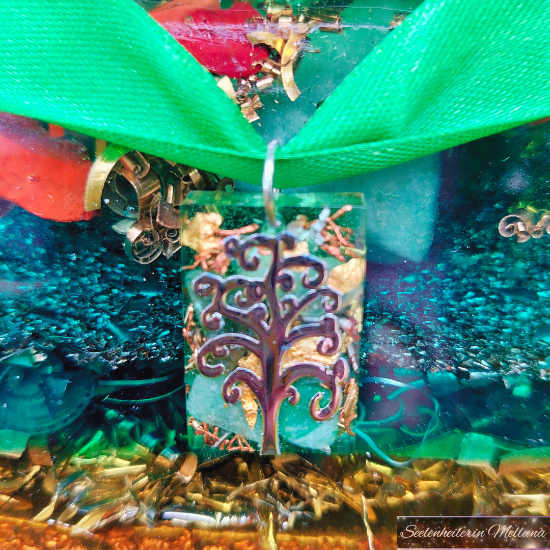*BESONDERHEIT: Die Pyramide besitzt ein grünes Band zusammen mit einer Schleife. Daran hängt ein rechteckiges Orgonit-Medaillon, worauf das Abbild vom Lebensbaum zu erkennen ist.