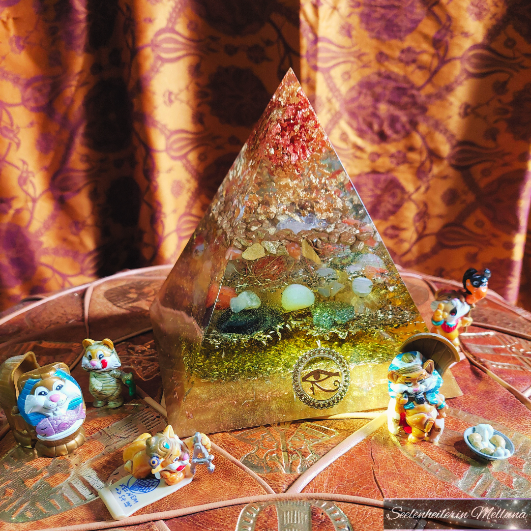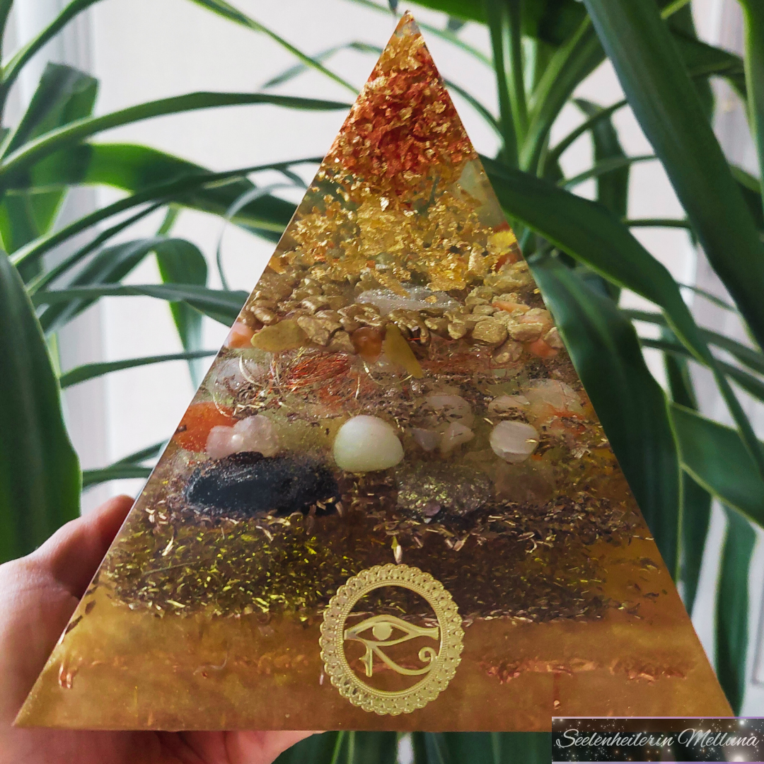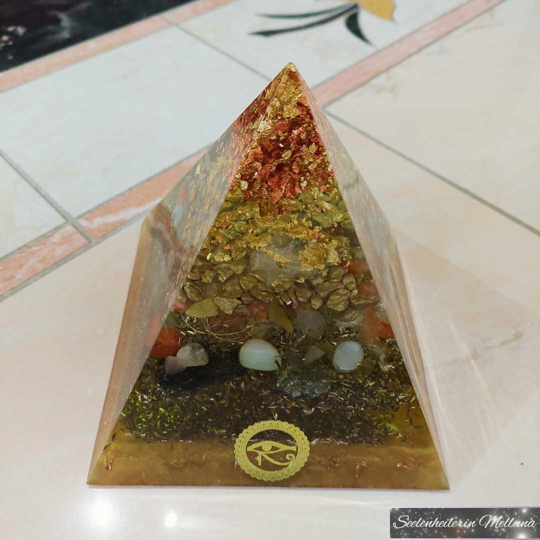 Hierin befinden sich u. a. Bergkristall-, Tigerauge- & Karneol-Trommelsteine. Weiterhin sind in der Pyramide enthalten: Sonnenstein-, Pyrit-, Schungit- & Bergkristall-Rohsteine - aufgeladen im Sonnenlicht & mit Bergkristall.