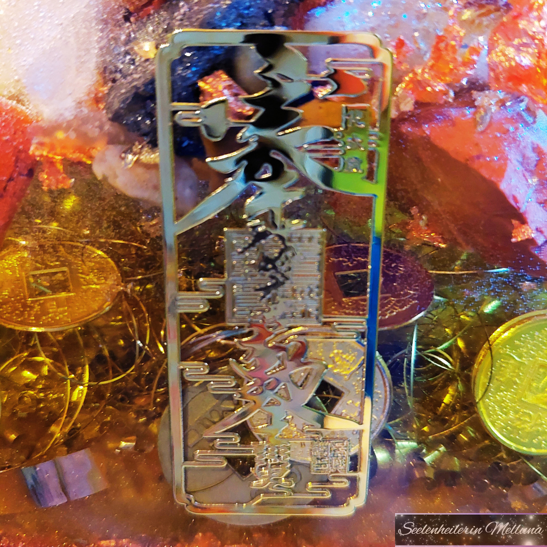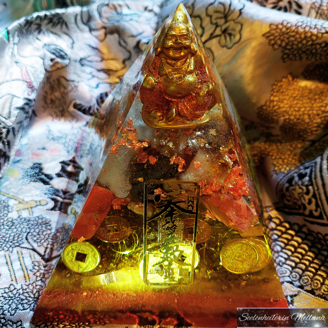Weiterhin sind chinesische (auf alt gemachte) Geldmünzen darin & die Spitze der Pyramide enthält eine Glücksbuddha-Figur.