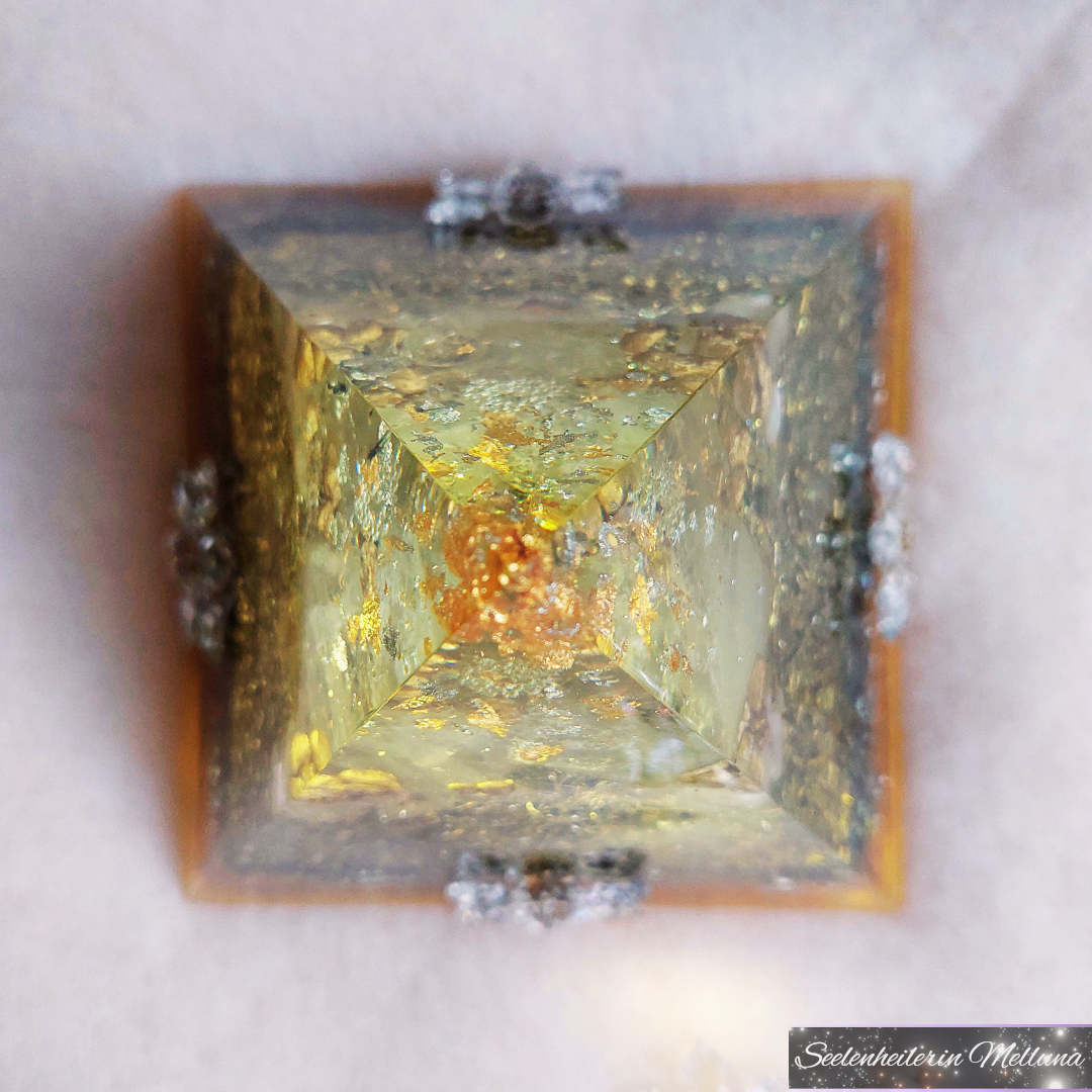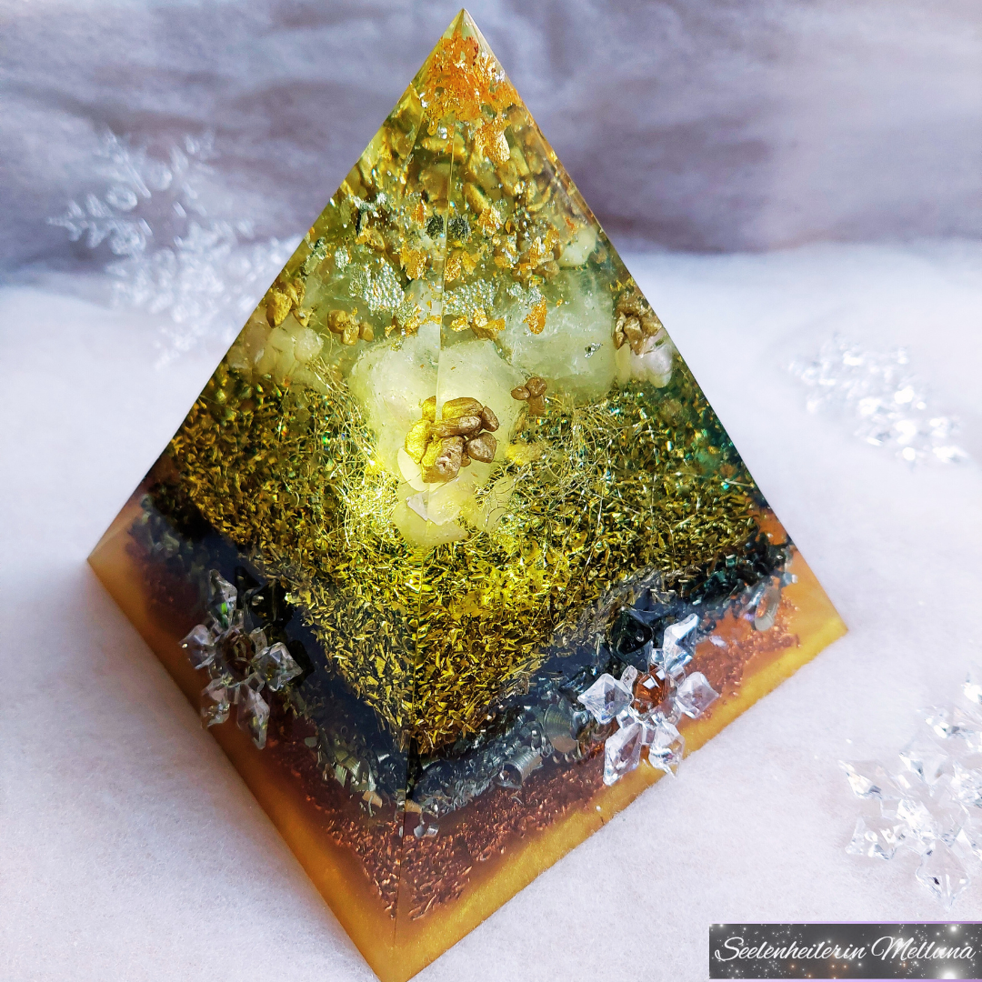 Orgonit-Modell: "Schneekristall-Pyramide"Hierin befinden sich u. a. Bergkristall-Rohsteine - aufgeladen im Sonnenlicht.Breite: 15 x 15 cm; Höhe 16 cm; Gewicht: ca. 1,4 kg - Preis: 149 € inkl. MwSt.