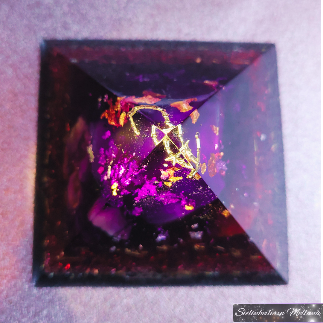 In der Pyramide befinden sich u.a. Achat-, Crazy Lace-Achat-, Karneol- & schwarze Obsidian-Rohsteine - aufgeladen mit Sonnenlicht sowie kleine Granat-Splitter.